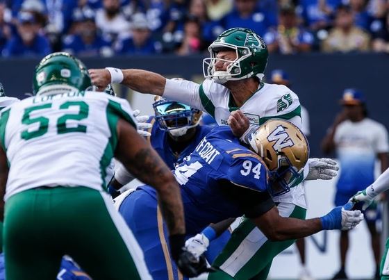 The Winnipeg Blue Bombers were not happy with Rider Pete Robertson's late hit of QB Zach Collaros, the punishment handed out by the league for the hit, nor the loss the Riders handed them at the annual Labour Day Classic. And it showed at this weekend's Banjo Bowl rematch in Winnipeg.